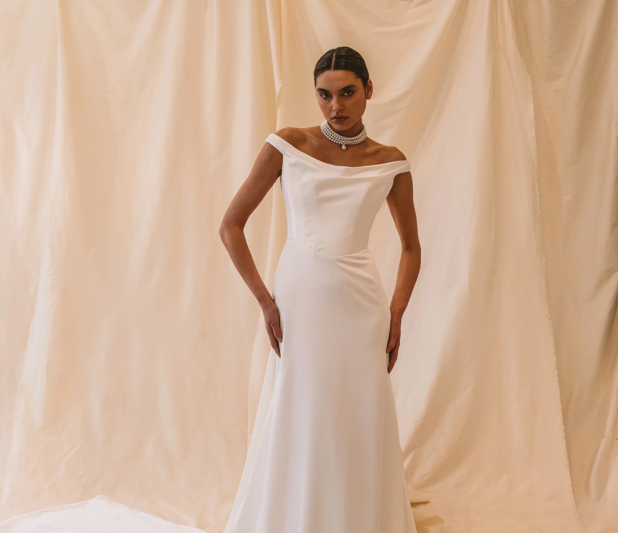 Impeccably structured bodices, artful draping, and fluid skirts create silhouettes that feel both powerful and effortlessly feminine. Subtle blush undertones, delicate lace detailing, and fashion-forward elements such as detachable toppers, convertible skirts, and modern accessories allow each look to evolve seamlessly from ceremony to celebration.